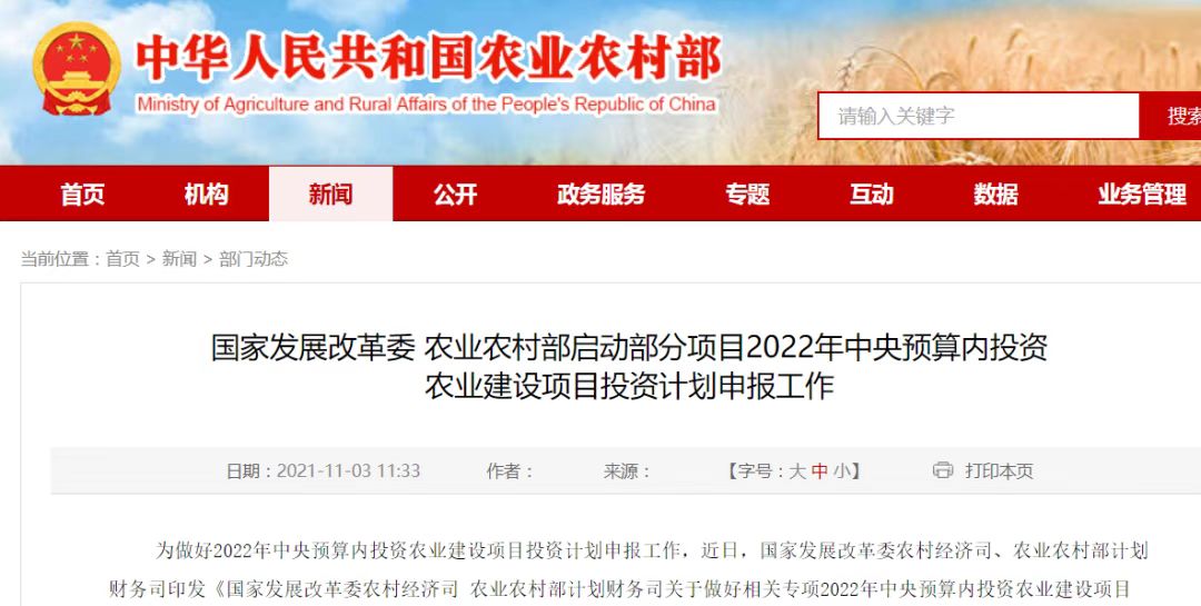 《通知》還明確,各地要結合本地財政承受能力和政府投資能力合理申報中央預算內投資計劃,于2021年12月10日前將投資計劃申報文件聯合報送至國家發展改革委、農業農村部。
